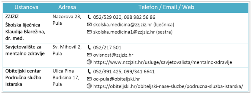 Osim škole, možete se obratiti i ostalim službama koje pružaju usluge savjetovanja i pomoći izvan škole (školska liječnica, Savjetovalište za mentalno zdravlje, Obiteljski centar).