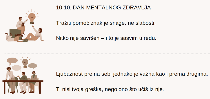 Dan mentalnog zdravlja, koji se svake godine obilježava 10. listopada, posvećen je podizanju svijesti o mentalnom zdravlju, promicanju brige o sebi te borbi protiv stigme i diskriminacije.